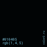 Цвет #010405 в цветовой модели RGB обозначается тремя октетами (1, 4, 5) в десятичном формате и #010405 в шестнадцатиричном (hex) формате, которые являются интенсивностью красного 1 (hex 01), интенсивность зелёного 4 (hex 04) и интенсивность синего 5 (hex 05).