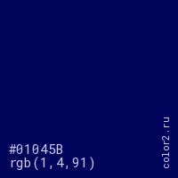 Цвет #01045B в цветовой модели RGB обозначается тремя октетами (1, 4, 91) в десятичном формате и #01045B в шестнадцатиричном (hex) формате, которые являются интенсивностью красного 1 (hex 01), интенсивность зелёного 4 (hex 04) и интенсивность синего 91 (hex 5B).