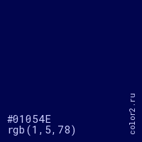 Цвет #01054E в цветовой модели RGB обозначается тремя октетами (1, 5, 78) в десятичном формате и #01054E в шестнадцатиричном (hex) формате, которые являются интенсивностью красного 1 (hex 01), интенсивность зелёного 5 (hex 05) и интенсивность синего 78 (hex 4E).