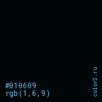 Цвет #010609 в цветовой модели RGB обозначается тремя октетами (1, 6, 9) в десятичном формате и #010609 в шестнадцатиричном (hex) формате, которые являются интенсивностью красного 1 (hex 01), интенсивность зелёного 6 (hex 06) и интенсивность синего 9 (hex 09).