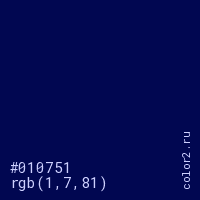 Цвет #010751 в цветовой модели RGB обозначается тремя октетами (1, 7, 81) в десятичном формате и #010751 в шестнадцатиричном (hex) формате, которые являются интенсивностью красного 1 (hex 01), интенсивность зелёного 7 (hex 07) и интенсивность синего 81 (hex 51).