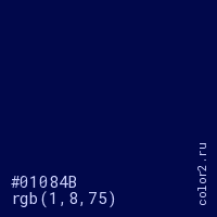 Цвет #01084B в цветовой модели RGB обозначается тремя октетами (1, 8, 75) в десятичном формате и #01084B в шестнадцатиричном (hex) формате, которые являются интенсивностью красного 1 (hex 01), интенсивность зелёного 8 (hex 08) и интенсивность синего 75 (hex 4B).