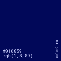 Цвет #010859 в цветовой модели RGB обозначается тремя октетами (1, 8, 89) в десятичном формате и #010859 в шестнадцатиричном (hex) формате, которые являются интенсивностью красного 1 (hex 01), интенсивность зелёного 8 (hex 08) и интенсивность синего 89 (hex 59).