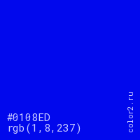 Цвет #0108ED в цветовой модели RGB обозначается тремя октетами (1, 8, 237) в десятичном формате и #0108ED в шестнадцатиричном (hex) формате, которые являются интенсивностью красного 1 (hex 01), интенсивность зелёного 8 (hex 08) и интенсивность синего 237 (hex ED).