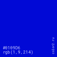 Цвет #0109D6 в цветовой модели RGB обозначается тремя октетами (1, 9, 214) в десятичном формате и #0109D6 в шестнадцатиричном (hex) формате, которые являются интенсивностью красного 1 (hex 01), интенсивность зелёного 9 (hex 09) и интенсивность синего 214 (hex D6).