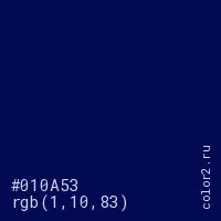 Цвет #010A53 в цветовой модели RGB обозначается тремя октетами (1, 10, 83) в десятичном формате и #010A53 в шестнадцатиричном (hex) формате, которые являются интенсивностью красного 1 (hex 01), интенсивность зелёного 10 (hex 0A) и интенсивность синего 83 (hex 53).