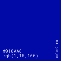 Цвет #010AA6 в цветовой модели RGB обозначается тремя октетами (1, 10, 166) в десятичном формате и #010AA6 в шестнадцатиричном (hex) формате, которые являются интенсивностью красного 1 (hex 01), интенсивность зелёного 10 (hex 0A) и интенсивность синего 166 (hex A6).