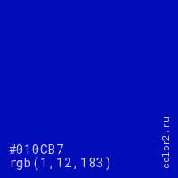 Цвет #010CB7 в цветовой модели RGB обозначается тремя октетами (1, 12, 183) в десятичном формате и #010CB7 в шестнадцатиричном (hex) формате, которые являются интенсивностью красного 1 (hex 01), интенсивность зелёного 12 (hex 0C) и интенсивность синего 183 (hex B7).