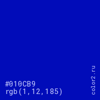 Цвет #010CB9 в цветовой модели RGB обозначается тремя октетами (1, 12, 185) в десятичном формате и #010CB9 в шестнадцатиричном (hex) формате, которые являются интенсивностью красного 1 (hex 01), интенсивность зелёного 12 (hex 0C) и интенсивность синего 185 (hex B9).