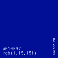 Цвет #010F97 в цветовой модели RGB обозначается тремя октетами (1, 15, 151) в десятичном формате и #010F97 в шестнадцатиричном (hex) формате, которые являются интенсивностью красного 1 (hex 01), интенсивность зелёного 15 (hex 0F) и интенсивность синего 151 (hex 97).