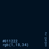 Цвет #011222 в цветовой модели RGB обозначается тремя октетами (1, 18, 34) в десятичном формате и #011222 в шестнадцатиричном (hex) формате, которые являются интенсивностью красного 1 (hex 01), интенсивность зелёного 18 (hex 12) и интенсивность синего 34 (hex 22).