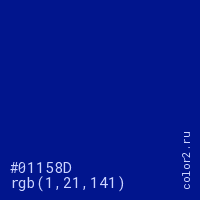 Цвет #01158D в цветовой модели RGB обозначается тремя октетами (1, 21, 141) в десятичном формате и #01158D в шестнадцатиричном (hex) формате, которые являются интенсивностью красного 1 (hex 01), интенсивность зелёного 21 (hex 15) и интенсивность синего 141 (hex 8D).