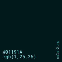 Цвет #01191A в цветовой модели RGB обозначается тремя октетами (1, 25, 26) в десятичном формате и #01191A в шестнадцатиричном (hex) формате, которые являются интенсивностью красного 1 (hex 01), интенсивность зелёного 25 (hex 19) и интенсивность синего 26 (hex 1A).