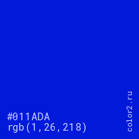 Цвет #011ADA в цветовой модели RGB обозначается тремя октетами (1, 26, 218) в десятичном формате и #011ADA в шестнадцатиричном (hex) формате, которые являются интенсивностью красного 1 (hex 01), интенсивность зелёного 26 (hex 1A) и интенсивность синего 218 (hex DA).