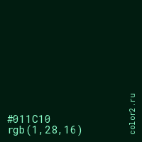 Цвет #011C10 в цветовой модели RGB обозначается тремя октетами (1, 28, 16) в десятичном формате и #011C10 в шестнадцатиричном (hex) формате, которые являются интенсивностью красного 1 (hex 01), интенсивность зелёного 28 (hex 1C) и интенсивность синего 16 (hex 10).