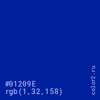 Цвет #01209E в цветовой модели RGB обозначается тремя октетами (1, 32, 158) в десятичном формате и #01209E в шестнадцатиричном (hex) формате, которые являются интенсивностью красного 1 (hex 01), интенсивность зелёного 32 (hex 20) и интенсивность синего 158 (hex 9E).