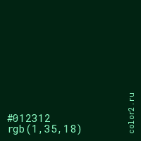 Цвет #012312 в цветовой модели RGB обозначается тремя октетами (1, 35, 18) в десятичном формате и #012312 в шестнадцатиричном (hex) формате, которые являются интенсивностью красного 1 (hex 01), интенсивность зелёного 35 (hex 23) и интенсивность синего 18 (hex 12).