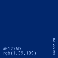 Цвет #01276D в цветовой модели RGB обозначается тремя октетами (1, 39, 109) в десятичном формате и #01276D в шестнадцатиричном (hex) формате, которые являются интенсивностью красного 1 (hex 01), интенсивность зелёного 39 (hex 27) и интенсивность синего 109 (hex 6D).