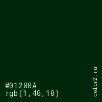 Цвет #01280A в цветовой модели RGB обозначается тремя октетами (1, 40, 10) в десятичном формате и #01280A в шестнадцатиричном (hex) формате, которые являются интенсивностью красного 1 (hex 01), интенсивность зелёного 40 (hex 28) и интенсивность синего 10 (hex 0A).
