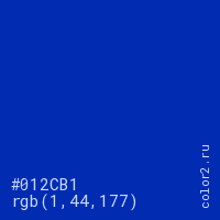 Цвет #012CB1 в цветовой модели RGB обозначается тремя октетами (1, 44, 177) в десятичном формате и #012CB1 в шестнадцатиричном (hex) формате, которые являются интенсивностью красного 1 (hex 01), интенсивность зелёного 44 (hex 2C) и интенсивность синего 177 (hex B1).