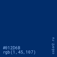 Цвет #012D6B в цветовой модели RGB обозначается тремя октетами (1, 45, 107) в десятичном формате и #012D6B в шестнадцатиричном (hex) формате, которые являются интенсивностью красного 1 (hex 01), интенсивность зелёного 45 (hex 2D) и интенсивность синего 107 (hex 6B).