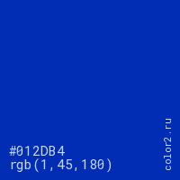 Цвет #012DB4 в цветовой модели RGB обозначается тремя октетами (1, 45, 180) в десятичном формате и #012DB4 в шестнадцатиричном (hex) формате, которые являются интенсивностью красного 1 (hex 01), интенсивность зелёного 45 (hex 2D) и интенсивность синего 180 (hex B4).