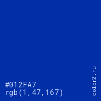 Цвет #012FA7 в цветовой модели RGB обозначается тремя октетами (1, 47, 167) в десятичном формате и #012FA7 в шестнадцатиричном (hex) формате, которые являются интенсивностью красного 1 (hex 01), интенсивность зелёного 47 (hex 2F) и интенсивность синего 167 (hex A7).