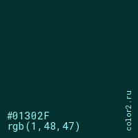 Цвет #01302F в цветовой модели RGB обозначается тремя октетами (1, 48, 47) в десятичном формате и #01302F в шестнадцатиричном (hex) формате, которые являются интенсивностью красного 1 (hex 01), интенсивность зелёного 48 (hex 30) и интенсивность синего 47 (hex 2F).