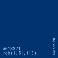 Цвет #013371 в цветовой модели RGB обозначается тремя октетами (1, 51, 113) в десятичном формате и #013371 в шестнадцатиричном (hex) формате, которые являются интенсивностью красного 1 (hex 01), интенсивность зелёного 51 (hex 33) и интенсивность синего 113 (hex 71).