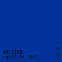 Цвет #013398 в цветовой модели RGB обозначается тремя октетами (1, 51, 152) в десятичном формате и #013398 в шестнадцатиричном (hex) формате, которые являются интенсивностью красного 1 (hex 01), интенсивность зелёного 51 (hex 33) и интенсивность синего 152 (hex 98).