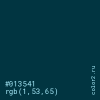 Цвет #013541 в цветовой модели RGB обозначается тремя октетами (1, 53, 65) в десятичном формате и #013541 в шестнадцатиричном (hex) формате, которые являются интенсивностью красного 1 (hex 01), интенсивность зелёного 53 (hex 35) и интенсивность синего 65 (hex 41).