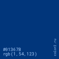 Цвет #01367B в цветовой модели RGB обозначается тремя октетами (1, 54, 123) в десятичном формате и #01367B в шестнадцатиричном (hex) формате, которые являются интенсивностью красного 1 (hex 01), интенсивность зелёного 54 (hex 36) и интенсивность синего 123 (hex 7B).
