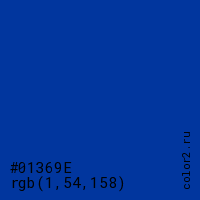 Цвет #01369E в цветовой модели RGB обозначается тремя октетами (1, 54, 158) в десятичном формате и #01369E в шестнадцатиричном (hex) формате, которые являются интенсивностью красного 1 (hex 01), интенсивность зелёного 54 (hex 36) и интенсивность синего 158 (hex 9E).