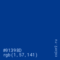 Цвет #01398D в цветовой модели RGB обозначается тремя октетами (1, 57, 141) в десятичном формате и #01398D в шестнадцатиричном (hex) формате, которые являются интенсивностью красного 1 (hex 01), интенсивность зелёного 57 (hex 39) и интенсивность синего 141 (hex 8D).