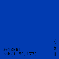 Цвет #013BB1 в цветовой модели RGB обозначается тремя октетами (1, 59, 177) в десятичном формате и #013BB1 в шестнадцатиричном (hex) формате, которые являются интенсивностью красного 1 (hex 01), интенсивность зелёного 59 (hex 3B) и интенсивность синего 177 (hex B1).