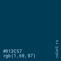 Цвет #013C57 в цветовой модели RGB обозначается тремя октетами (1, 60, 87) в десятичном формате и #013C57 в шестнадцатиричном (hex) формате, которые являются интенсивностью красного 1 (hex 01), интенсивность зелёного 60 (hex 3C) и интенсивность синего 87 (hex 57).