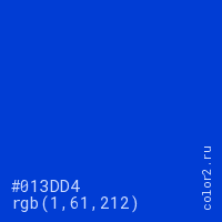 Цвет #013DD4 в цветовой модели RGB обозначается тремя октетами (1, 61, 212) в десятичном формате и #013DD4 в шестнадцатиричном (hex) формате, которые являются интенсивностью красного 1 (hex 01), интенсивность зелёного 61 (hex 3D) и интенсивность синего 212 (hex D4).
