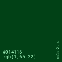 Цвет #014116 в цветовой модели RGB обозначается тремя октетами (1, 65, 22) в десятичном формате и #014116 в шестнадцатиричном (hex) формате, которые являются интенсивностью красного 1 (hex 01), интенсивность зелёного 65 (hex 41) и интенсивность синего 22 (hex 16).