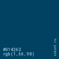 Цвет #014262 в цветовой модели RGB обозначается тремя октетами (1, 66, 98) в десятичном формате и #014262 в шестнадцатиричном (hex) формате, которые являются интенсивностью красного 1 (hex 01), интенсивность зелёного 66 (hex 42) и интенсивность синего 98 (hex 62).