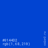 Цвет #0144D2 в цветовой модели RGB обозначается тремя октетами (1, 68, 210) в десятичном формате и #0144D2 в шестнадцатиричном (hex) формате, которые являются интенсивностью красного 1 (hex 01), интенсивность зелёного 68 (hex 44) и интенсивность синего 210 (hex D2).