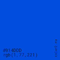 Цвет #014DDD в цветовой модели RGB обозначается тремя октетами (1, 77, 221) в десятичном формате и #014DDD в шестнадцатиричном (hex) формате, которые являются интенсивностью красного 1 (hex 01), интенсивность зелёного 77 (hex 4D) и интенсивность синего 221 (hex DD).