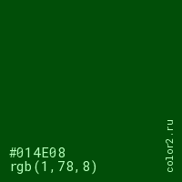 Цвет #014E08 в цветовой модели RGB обозначается тремя октетами (1, 78, 8) в десятичном формате и #014E08 в шестнадцатиричном (hex) формате, которые являются интенсивностью красного 1 (hex 01), интенсивность зелёного 78 (hex 4E) и интенсивность синего 8 (hex 08).