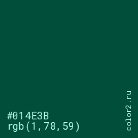 Цвет #014E3B в цветовой модели RGB обозначается тремя октетами (1, 78, 59) в десятичном формате и #014E3B в шестнадцатиричном (hex) формате, которые являются интенсивностью красного 1 (hex 01), интенсивность зелёного 78 (hex 4E) и интенсивность синего 59 (hex 3B).