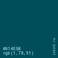Цвет #014E5B в цветовой модели RGB обозначается тремя октетами (1, 78, 91) в десятичном формате и #014E5B в шестнадцатиричном (hex) формате, которые являются интенсивностью красного 1 (hex 01), интенсивность зелёного 78 (hex 4E) и интенсивность синего 91 (hex 5B).