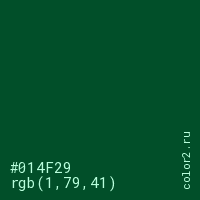 Цвет #014F29 в цветовой модели RGB обозначается тремя октетами (1, 79, 41) в десятичном формате и #014F29 в шестнадцатиричном (hex) формате, которые являются интенсивностью красного 1 (hex 01), интенсивность зелёного 79 (hex 4F) и интенсивность синего 41 (hex 29).