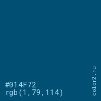 Цвет #014F72 в цветовой модели RGB обозначается тремя октетами (1, 79, 114) в десятичном формате и #014F72 в шестнадцатиричном (hex) формате, которые являются интенсивностью красного 1 (hex 01), интенсивность зелёного 79 (hex 4F) и интенсивность синего 114 (hex 72).
