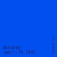 Цвет #014FEE в цветовой модели RGB обозначается тремя октетами (1, 79, 238) в десятичном формате и #014FEE в шестнадцатиричном (hex) формате, которые являются интенсивностью красного 1 (hex 01), интенсивность зелёного 79 (hex 4F) и интенсивность синего 238 (hex EE).