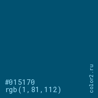 Цвет #015170 в цветовой модели RGB обозначается тремя октетами (1, 81, 112) в десятичном формате и #015170 в шестнадцатиричном (hex) формате, которые являются интенсивностью красного 1 (hex 01), интенсивность зелёного 81 (hex 51) и интенсивность синего 112 (hex 70).