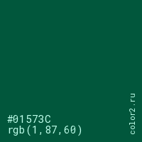 Цвет #01573C в цветовой модели RGB обозначается тремя октетами (1, 87, 60) в десятичном формате и #01573C в шестнадцатиричном (hex) формате, которые являются интенсивностью красного 1 (hex 01), интенсивность зелёного 87 (hex 57) и интенсивность синего 60 (hex 3C).