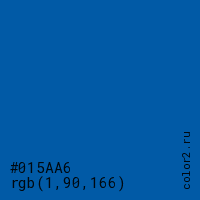 Цвет #015AA6 в цветовой модели RGB обозначается тремя октетами (1, 90, 166) в десятичном формате и #015AA6 в шестнадцатиричном (hex) формате, которые являются интенсивностью красного 1 (hex 01), интенсивность зелёного 90 (hex 5A) и интенсивность синего 166 (hex A6).